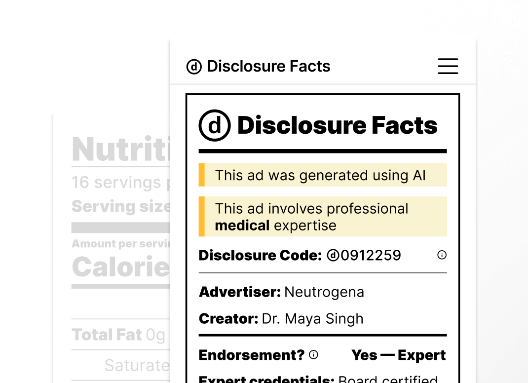 A universal clickable disclosure for creator ads (like Nutrition Facts for food) — simple, consistent, and aligned with ad compliance laws.